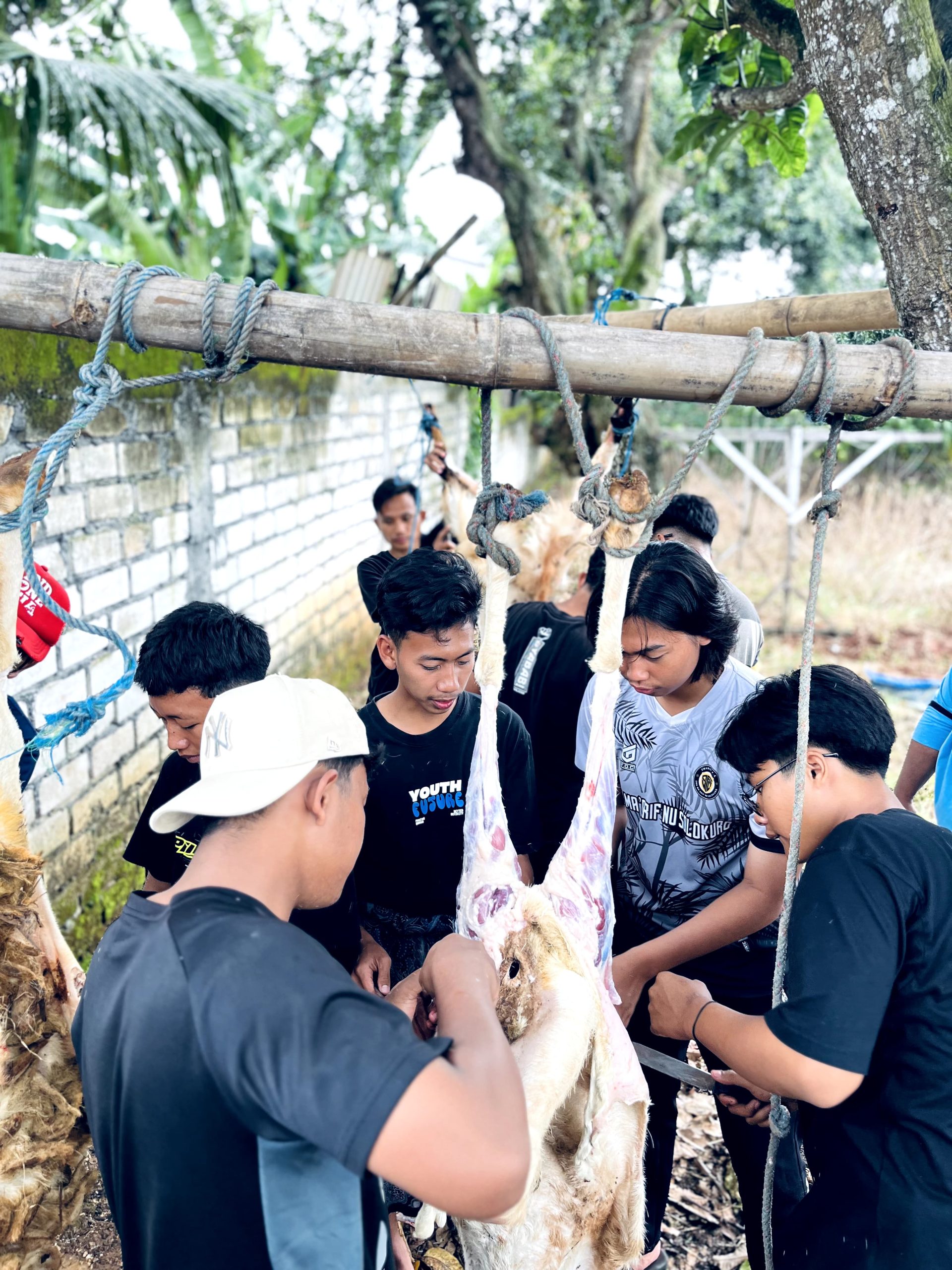 Aktivitas ini bukan sekadar ritual, tapi juga pembelajaran nyata tentang tanggung jawab, kebersamaan, dan nilai berbagi. Keterlibatan para santri sangat nyata, masing‑masing membantu memegang, menguliti, menyiapkan tali, hingga memastikan setiap langkah berjalan tertib dan penuh rasa hormat. Di balik kerja keras itu, terdapat dukungan santri dan wali santri yang menyerahkan hewan aqiqah dan shodaqoh sebagai bentuk dan syukur kepada Allah SWT. Kegiatan berlangsung pada tanggal 13 Februari 2026 di area luar dengan latar tembok dan pepohonan, menciptakan suasana sederhana namun khidmat. Lebih dari sekadar ritual keluarga, kegiatan ini membuka peluang bagi para santri dan wali untuk menyalurkan shodaqoh kepada lingkungan sekitar, termasuk kepada santriwan dan santriwati. Nilai syukur, semangat berbagi, serta penguatan karakter terwujud dalam setiap helai daging yang diproses, setiap tangan yang membantu, dan setiap doa yang dipanjatkan. Kegiatan sederhana ini menjadi bukti bahwa ibadah dapat sekaligus menjadi sekolah kehidupan yang mengajarkan gotong‑royong dan cinta sesama.